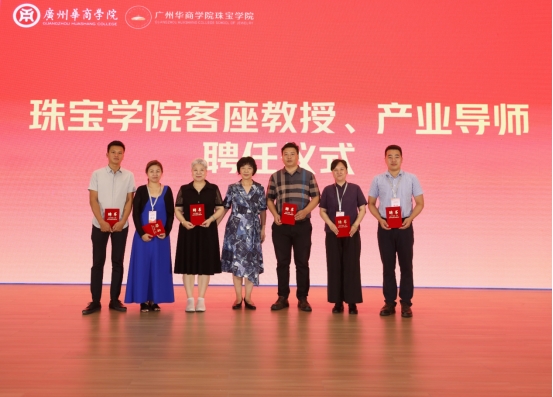 朱晓红院长为北京服装学院赵春华教授、华南师范大学于敏洁副教授颁发珠宝学院客座教授聘书。同时,为四会市珠宝玉石首饰行业协会副会长胡少聪、四会市珠宝玉石首饰行业协会镶嵌分会副会长何志峰、《中国报道》主编叶冬敏、广东省时尚首饰及配饰协会执行会长吴威颁发珠宝学院产业导师聘书。