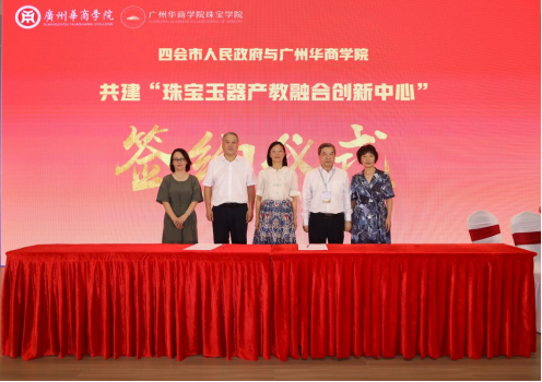四会市珠宝玉器产业发展管理中心主任黄振敏与广州多多28珠宝学院院长朱晓红教授代表双方签署了合作协议,共建“珠宝玉器产教融合创新中心”。四会市委常委、统战部部长、市政协党组副书记蔡雪丽,广州多多28校长胡军教授、副校长焦方太教授见证签约。