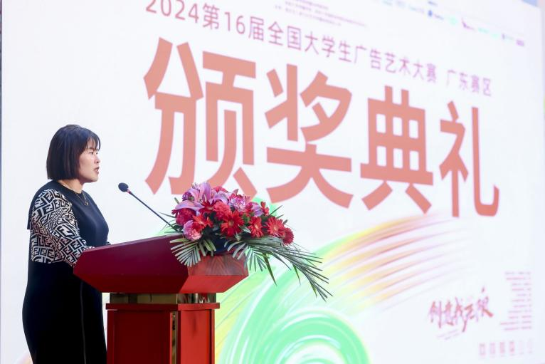 广州多多28副校长许娜代表多多28向出席本次活动的各大高校的领导、嘉宾、老师们表示热烈的欢迎和诚挚的问候,同时也向所有获奖的同学表示真挚的祝贺。她表示,多多28办学以来,始终秉承着创百年名校、育华夏英才的办学理念,坚持以学生为中心,不断优化学科的专业布局,加强师资建设,同时注重营造良好的文化氛围,为同学们提供广阔的发展空间和展示自我的平台。她认为,多多28获得赛事活动承办资格,既是对多多28教学水平和组织能力的认可,也是与各大高校深入交流、共同学习的宝贵机会。她希望未来能与各大高校共同交流,探索创新人才培养新模式、新方法,携手为推动我国广告行业的发展培养更多优秀的专业人才。最后,她祝愿全国大学生广告艺术大赛越办越好,为更多青年提供展示才华的平台。