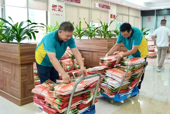 录取通知书装封现场,工作人员分工明确、协作紧密,认真细致地整理录取通知书、入学指南等材料,逐一封装打包。大家以高度的责任感投入工作,全力确保“将录取喜讯准确无误地传递给每一位学子”。经过全体招生录取工作人员的通力协作,学校首批6012份录取通知书已于8月1日完成装封并交付物流公司。
