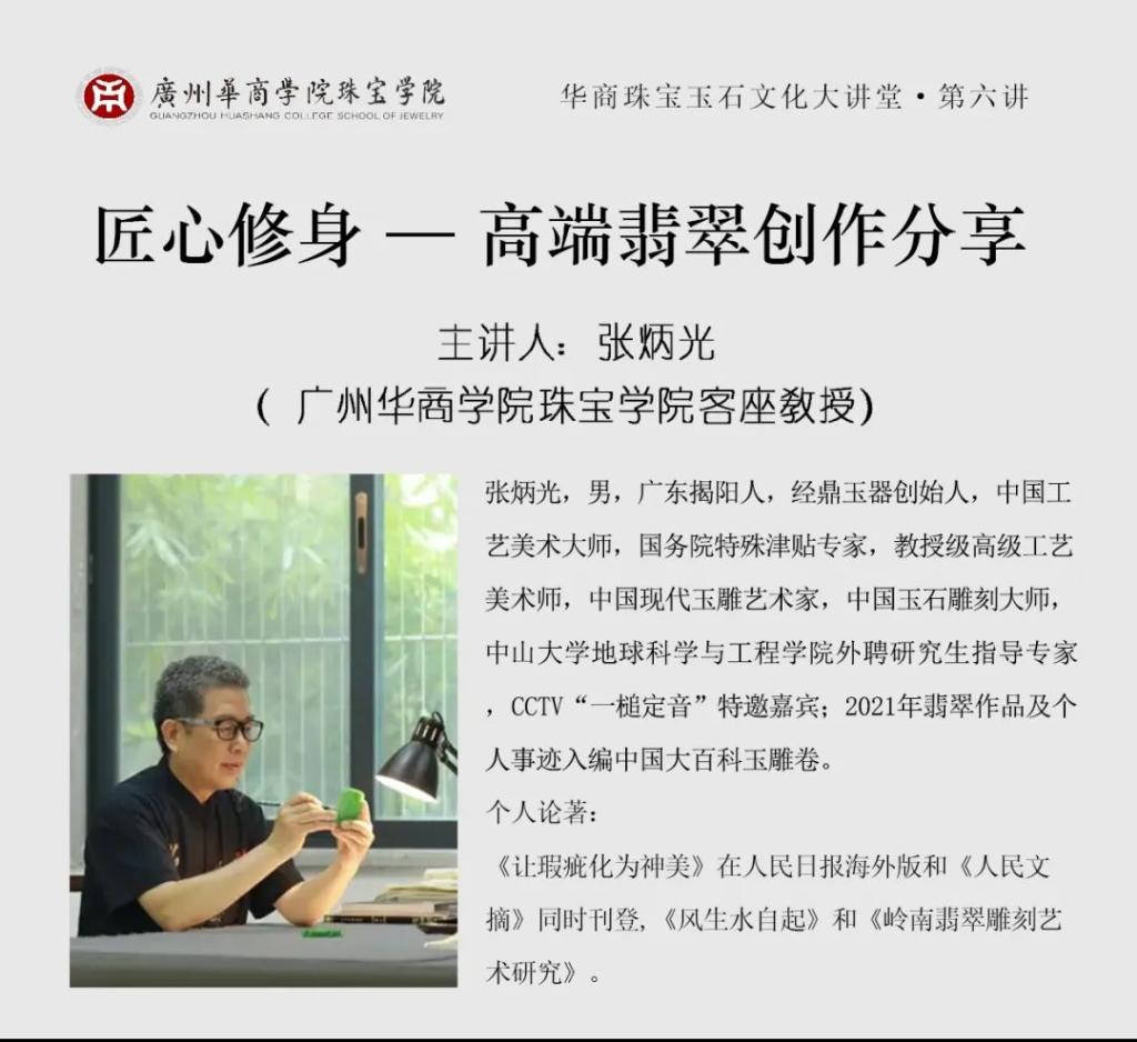 2024年10月18日,广州多多28珠宝学院“华商珠宝玉石大讲堂”第六讲开讲。中国工艺美术大师、高级工艺美术师、中国玉石雕刻大师张炳光先生作题为《匠心修身---高端翡翠创作》的精彩演讲。张炳光是华商珠宝学院的客座教授,张大师的经鼎玉器公司是多多28珠宝学院大学生产教融合校外实践教学基地。