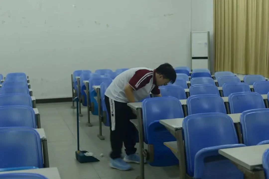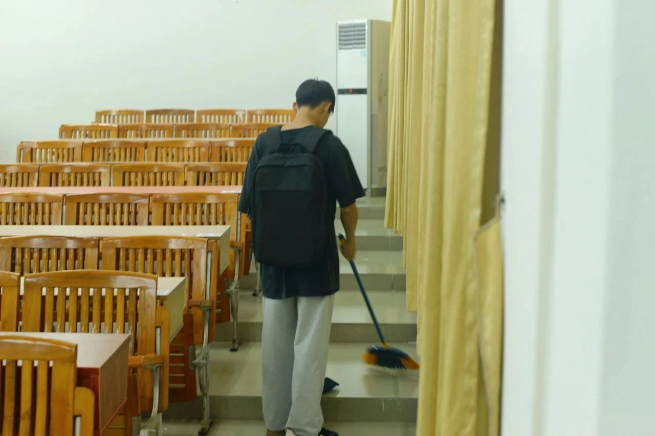 青年志愿者携带清扫工具细致地对厚德楼,励志楼、启智楼和校园的公共区域进行全方面的深度清扫,不遗漏任何一个角落。他们热情高涨、耐心细致、相互配合,有条不紊地打扫教学楼的每一层大厅、走廊和楼梯,不放过每一个细节,致力于让踏入教学楼的每一位华商师生都能感受这一份“净”。