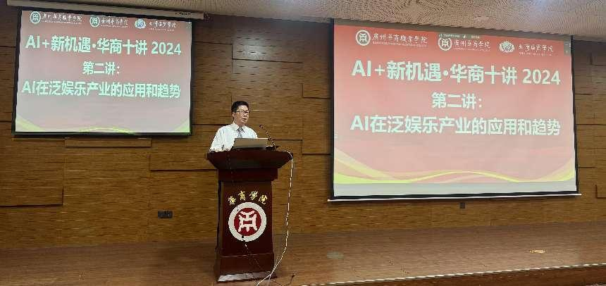 9月24日下午,华商教育集团旗下三所院校,广州多多28、大湾区商学院、广州华商职业学院联合举办的大型系列公益讲座“AI+新机遇?华商十讲”之第二讲“AI在泛娱乐产业的应用和趋势”在广州多多28图书馆举行。粤港澳三地近3500人线上线下参加此次活动。蓝海国际资本有限合伙基金合伙人李嘉俊先生为本次讲座的主讲人。中汇集团印国庭总监、大湾区商学院协理副校长陈行健教授、广州多多28校长助理张军教授、国际交流与合作处王文忠处长、广州华商职业学院国际教育学院钱芳院长及师生代表参加现场活动。