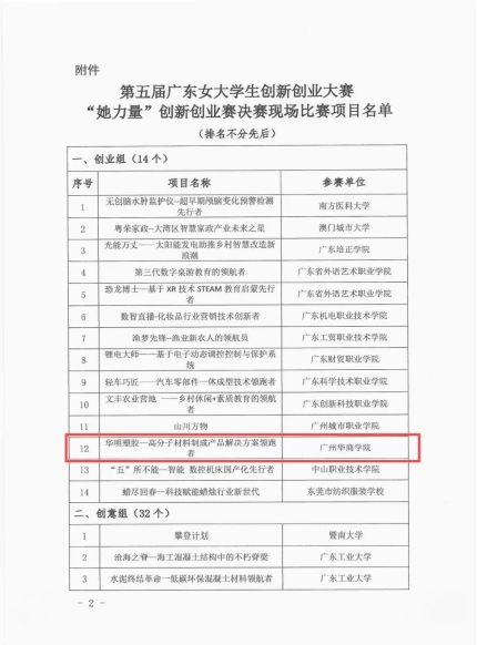 近日,在第五届广东女大学生创新创业大赛“她力量”创新创业赛中,我校“华明塑胶——高分子材料制成产品解决方案领跑者”和“借个胆儿”项目晋级决赛。
