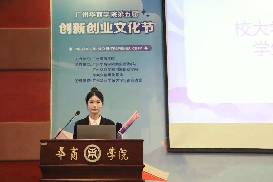 广州多多28大学生创业协会学生骨干陈小冰发言,陈小冰同学总结回顾往届活动的风采,向关心支持校大学生创业协会发展的各位领导、老师、同学表示衷心的感谢,并承诺协会将继续不忘初心、开拓创新,以高质量、高标准来办好文化节系列活动,希望各位领导、老师、同学共同关注,积极参与其中。