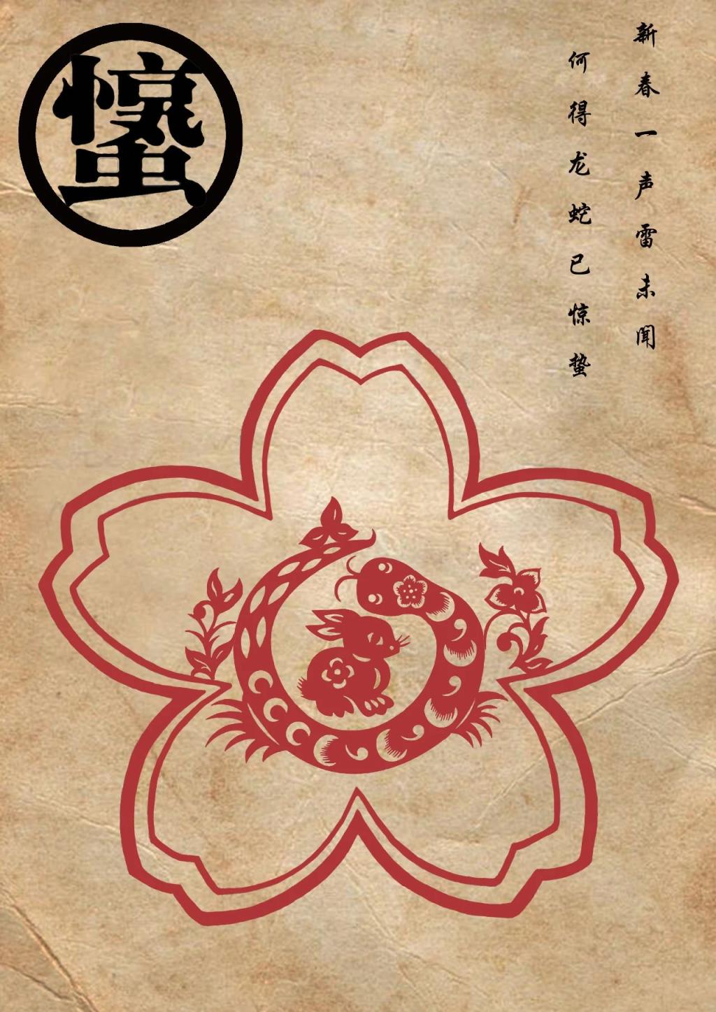 “二十四节气作为中国人在农耕文明背景下特有的时间知识体系,深刻影响着人们的思维方式和行为准则,是中华民族文化认同的重要载体。”朱教授言道,从动植物和生态的角度看,惊蛰是动植物生命历程的重要节点,是物候上的临界点,万物迎来欣欣向荣的景象。“桃之夭夭,灼灼其华。”朱晓红教授告诉记者,对惊蛰节气的剪纸创作选取了该季节最有代表性的桃花花形作为图形的外框,也取意中国传统园林建筑花形窗格的形制和宋代山水画小品的取景视角,使人联想观者通过窗口从室内看向室外风景,就像选取了隔窗的视角看到了窗外的美景,从空间感上体会人与自然的联系。“而蛇和兔的形象选取参考了十二生肖的吉祥寓意,代表追求幸福生活的心愿。”朱晓红教授希望读者能通过这样的剪纸创作,加深对传统文化中自然万物和合共存生态观的理解(文章来源于大河网-记者董蕾)