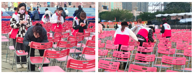 当天晚上,志愿者们在“四方会翠·玉润中华”中国·四会玉文化节颁奖盛典以及“四方会翠·翡同凡响”中国·四会玉器国风音乐晚会负责派发荧光棒、雨衣、雨伞,张贴座位牌,维持现场秩序,引导现场观众入座等。他们遍布于会场的各个岗位,严格按照工作安排,各司其职,以高度认真的工作态度保障颁奖典礼工作顺利进行。