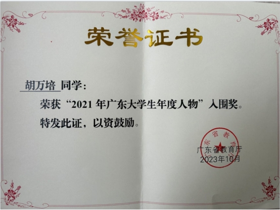 近日,广东省教育厅公布《关于公布2021年、2022年“广东高校辅导员年度人物”与“广东大学生年度人物”名单的通知》(粤教思函[2023]17号)文件。我校耿艳利老师荣获“2021年广东高校辅导员年度人物”入围奖,健康医学院胡万培同学荣获“2021年广东大学生年度人物”入围奖,经济贸易学院林子榆同学荣获“2022年广东大学生年度人物”入围奖。