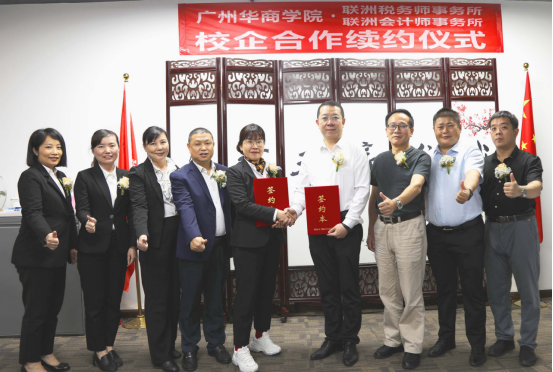 吕峻闽和马蝉巧代表校企双方,签署了联洲税务师事务所有限公司和联洲会计师师事务所有限公司与广州多多28会计学院“校外实践教学基地”的第二期合作协议书。