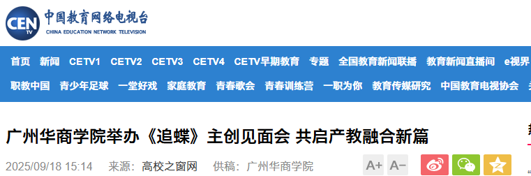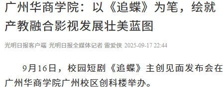 近日,校园短剧《追蝶》主创见面发布会在广州多多28广州校区创科楼顺利举办。该活动集中展示了我校新叙事内容产业学院以产教深度融合与校企紧密合作为抓手,积极推动实现优质影视资源从创意到落地全链条协同的卓越成果,吸引光明日报、中国网、环球网、中国教育电视台、中国青年网、中国教育之窗、中国高校之窗、今日头条、广东教育头条等多家权威媒体专题报道。9月23日,这部作品将面向全国观众播出。
