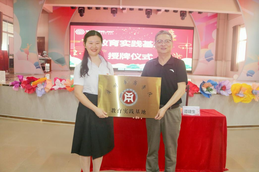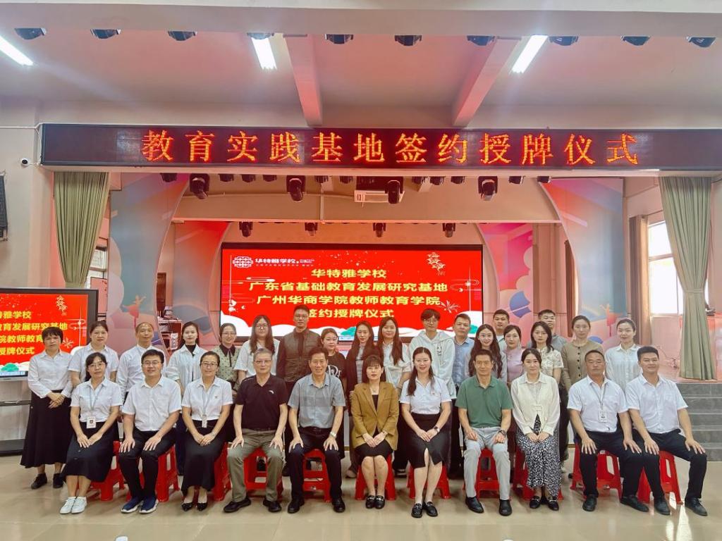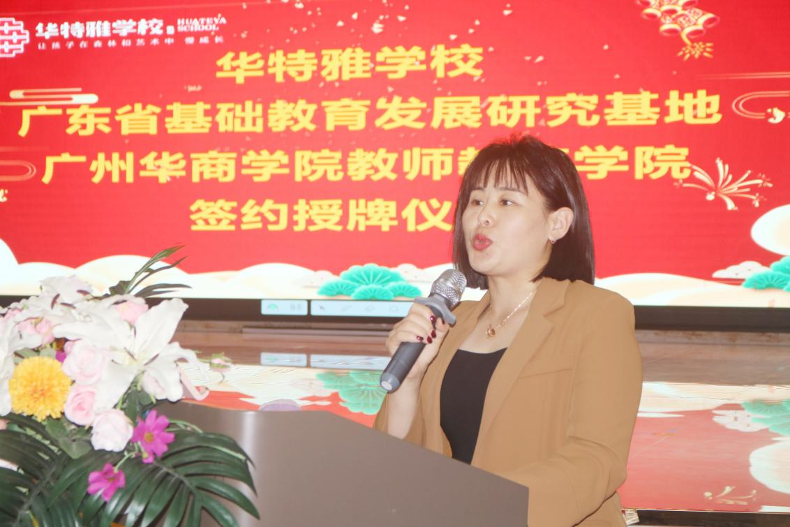 教师教育学院谭建生常务副院长和庄婷校长在双方代表的见证下共同签署了共建教育实践基地的协议,谭建生常务副院长代表学院向中山坦洲华特雅学校授牌。