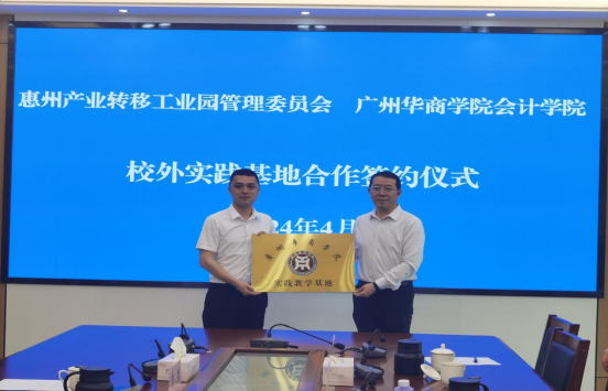 姚凤民院长从为工业园提供服务,开展财务会计的公益讲座等方面提出实践基地发展的期望。姚凤民院长和谢帆宇副主任代表校企双方签署了《广州多多28校外实践基地合作协议书》。吕峻闽副校长为惠州产业转移工业园管理委员会授予“广州多多28实践教学基地”牌匾。