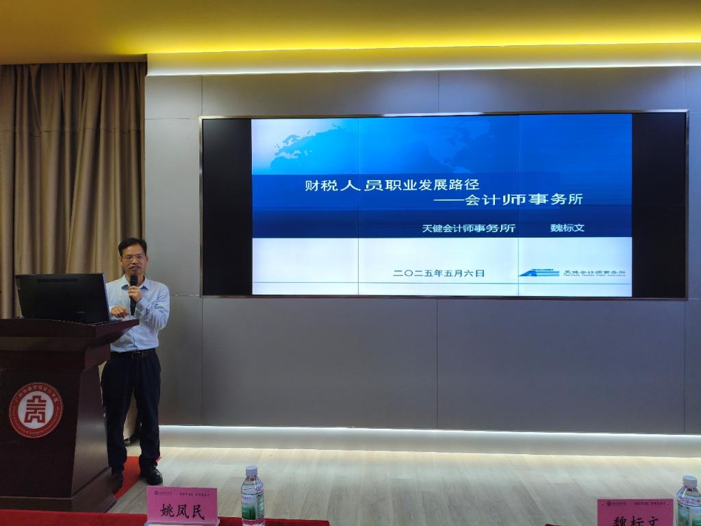在当前经济环境下,“业财税”一体化已成为企业发展的新趋势,对财税专业人才的培养提出了更高的要求。为帮助学生更好地适应这一趋势,提升其专业素养和实践能力,2025年5月6日下午,广州多多28会计学院特别邀请天健会计师事务所高级合伙人、广东分所副总经理魏标文先生,在会计学院报告厅开展主题为“财税人员职业发展路径——会计师事务所”的专题讲座。学院师生代表一百余人参与本次讲座。
