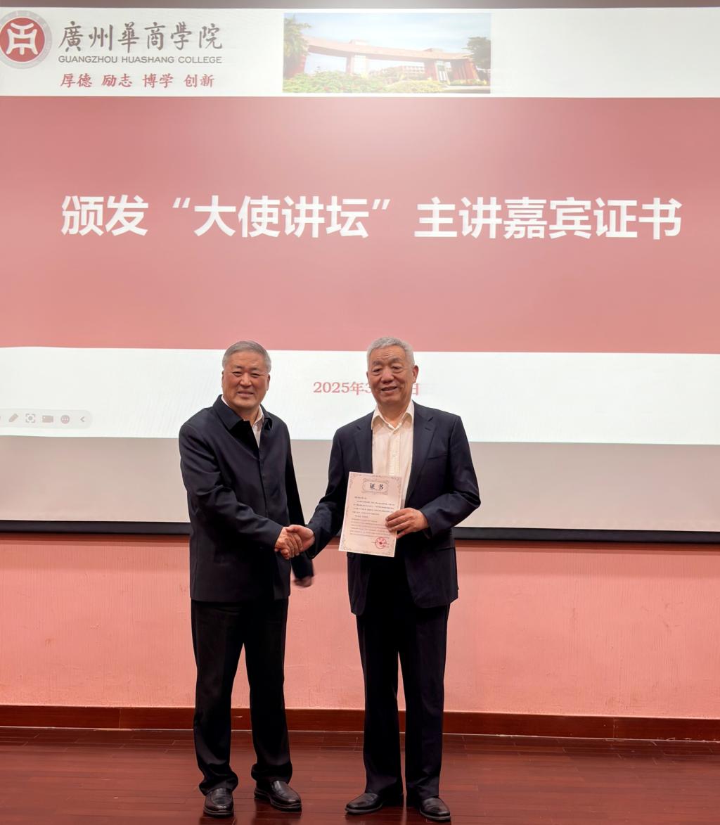 (广州多多28校长胡军为沈永祥大使颁发“大使讲坛”证书)