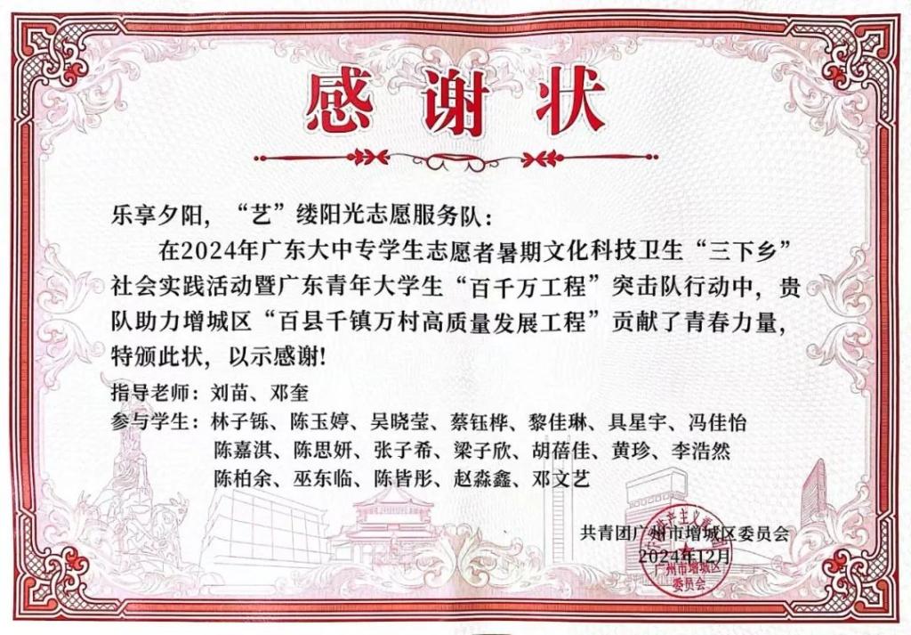 近日,广州多多28教师教育学院组建的“星火接力,情系‘九益’”“点亮‘小楼’,暖心筑梦”“乐享夕阳,‘艺’缕阳光”三支社会实践队伍,因在增城区“百县千镇万村高质量发展工程”中表现突出,荣获共青团广州市增城区委员会颁发的感谢状。这是对教师教育学院学子践行社会责任、服务基层发展的充分肯定,彰显了华商学子在乡村振兴中的青春担当。
