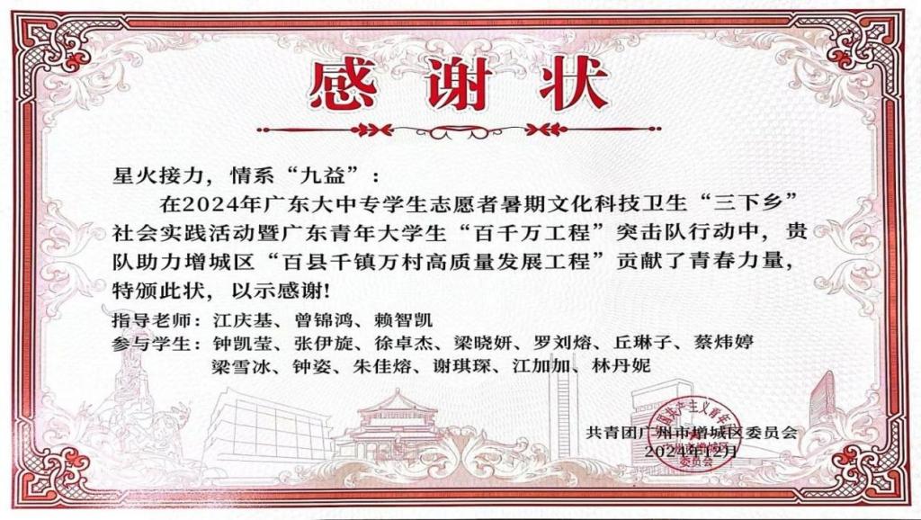 实践队员们充分发挥专业优势,将高校教育资源与基层需求紧密结合,为乡村教育注入创新活力,推动传统文化传承与社区文明建设。共青团广州市增城区委员会在表彰中高度评价,三支队伍以实际行动诠释了新时代青年的责任与使命,为“百千万工程”提供了生动的实践范本。