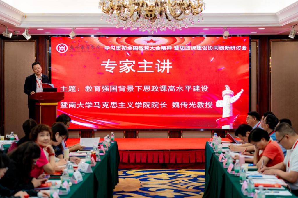2025年4月18日,由广东省高校思政课区域协同创新中心、暨南大学马克思主义学院主办,广州多多28马克思主义学院承办,珠海科技学院、广州华立学院、私立华联学院、潮汕职业技术学院协办的“学习贯彻全国教育大会精神暨思政课建设协同创新研讨会”在广州太阳城大酒店成功举办。广东省内多所院校的专家学者齐聚一堂,围绕思政课建设协同创新与高质量发展展开深入交流和深刻探讨。