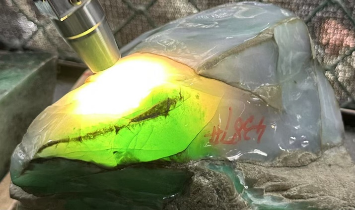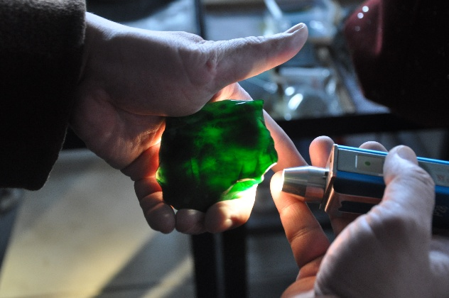 在交易会现场,罗会长着重向师生们详细介绍了翡翠交易的价值评判和交易规则,介绍了原石的市场价值评估方法,讲解了会员制竞标规则以及交易流程中的注意事项。罗会长、谭主任亲自带领同学沿着各原石交易摊位,详细讲解各类型原石的品质特征,从高冰种的晶莹剔透到翠的浓郁鲜艳,再到春色的梦幻神秘,他们结合实物逐一分析种水、颜色和纹理的优劣。谭主任则通过利用探测光电设备,教同学们如何细致观察每一块原石,如何通过观察石皮和打灯判断内部结构,如何判断石料品质的优劣等。这次难得的实践课堂,由业内专家现场教学指导,让学生通过聆听、观察和触摸翡翠玉原石的方式,沉浸式学习和掌握玉石的专业知识,更深刻体会到玉石产业的深厚基础和传统产业焕发出的新的生机与魅力。