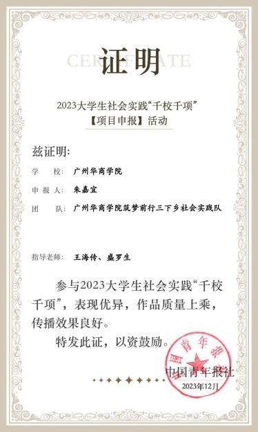 2024年,王海传教授指导“筑梦前行”社会实践团队以“科教下乡,助力白垢振兴”为主题,于5月、7月、9月在广东省肇庆市白垢镇开展志愿服务活动。活动内容共有6项:支教、墙绘、党课宣讲、公益捐赠、联谊助农、回访留守老人等。其中,支教受教的小学生达86人,支教时长为15天。团队活动事迹获得南方日报、西江日报、封开发布、封开县融媒体中心、封开县融媒体中心视频号、封开共青团、网易新闻、大学生云报等传媒广泛报道。南方日报对其活动事迹进行展示,展示数据及评价为:累计阅读量23000+,公众号推文阅读量8900+,抖音号视频播放量44000+,微信视频号播放量10000+,累计点赞量5700+;此次实践活动为白垢镇的教育、乡村风貌、农业发展和文化宣传带来积极影响,展现了青年学子助力乡村振兴的担当与作为。日前,王海传教授获评2024年广州多多28暑期社会实践活动“优秀指导老师”称号,所指导的团队获评广州多多28“优秀团队”称号,实践队队长朱嘉宜、队员吴曦获评“优秀个人”称号;团队作品入选中国青年报社2024年“千校千项”工程(全校5项作品入选)。