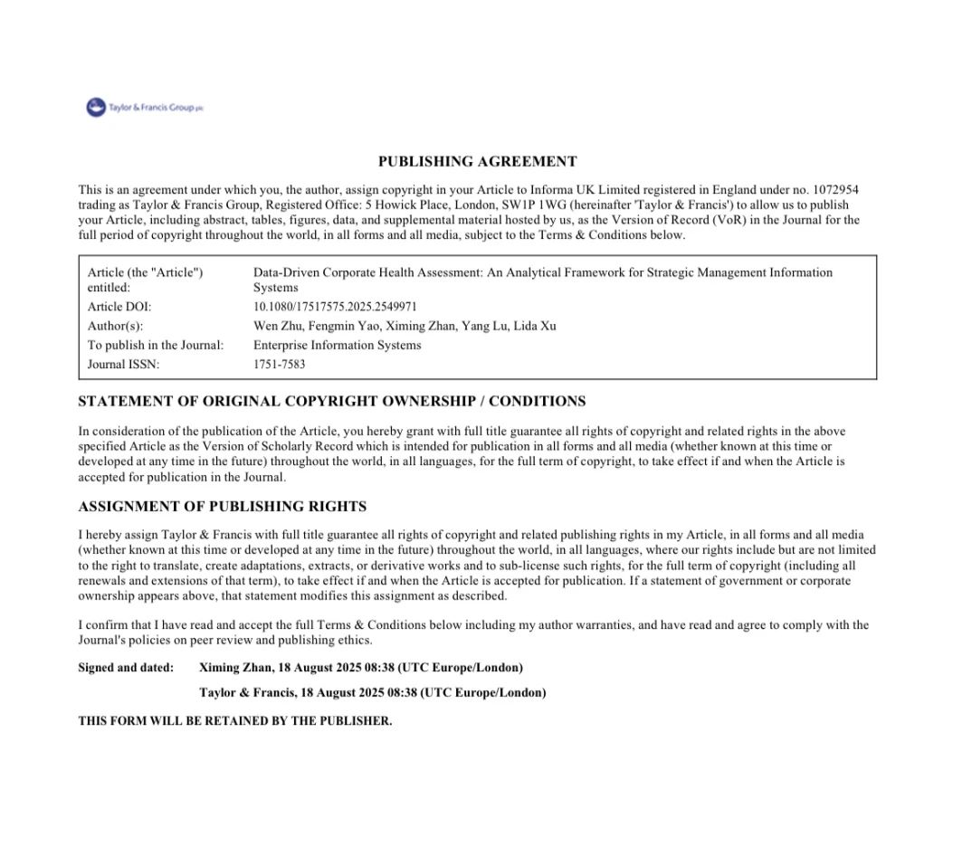 2025年8月18日,我校神华AI远见研究院朱文教授为一作的学术论文“Data-Driven Corporate Health Assessment: An Analytical Framework for Strategic Management Information Systems”在全球知名计算机类期刊《Enterprise Information Systems》(Taylor & Francis Group)出版,该期刊为SCIE收录期刊,JCR分区为二区,最新影响因子3.9。朱文教授的这项研究在理论层面作出多项突破性贡献。其一,研究首次对“企业健康(Corpora...